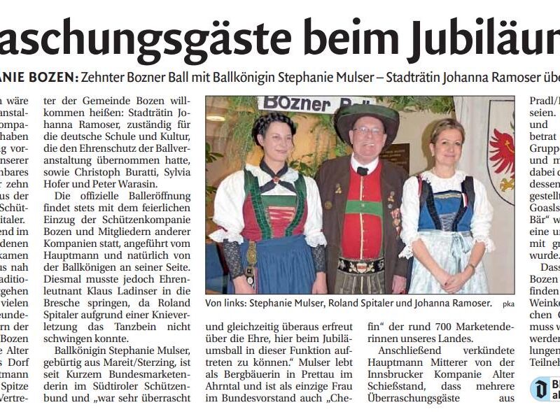 BOZEN – Bericht in der Tageszeitung Dolomiten vom 15.01.2024 über unseren Schützenball 2024.
