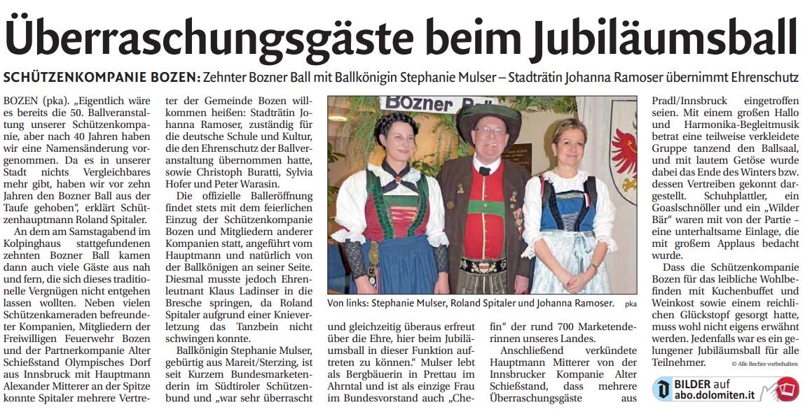 BOZEN – Bericht in der Tageszeitung Dolomiten vom 26.01.2026 über unseren traditionellen Bozner Ball.